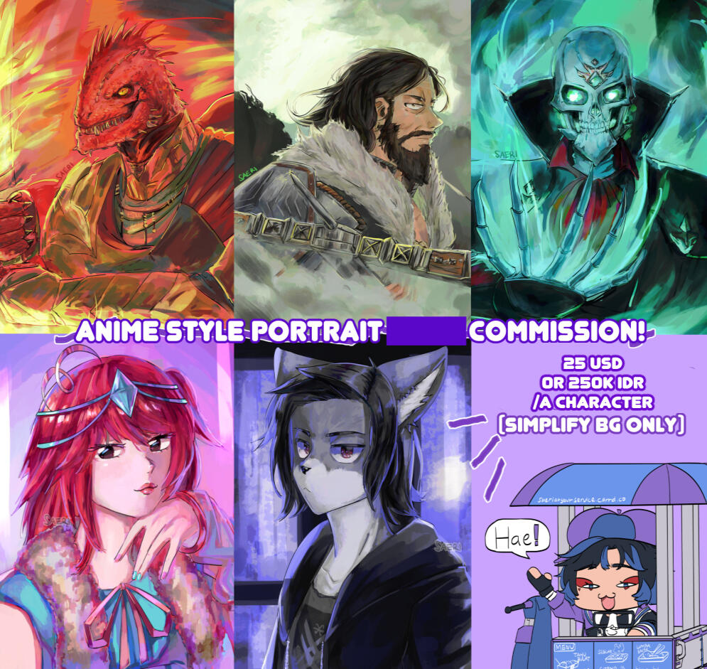 1) Anime Style Portrait CommissionSize A4 600dpi, Portrait Orientation, only Bust-Up and simplified BG.